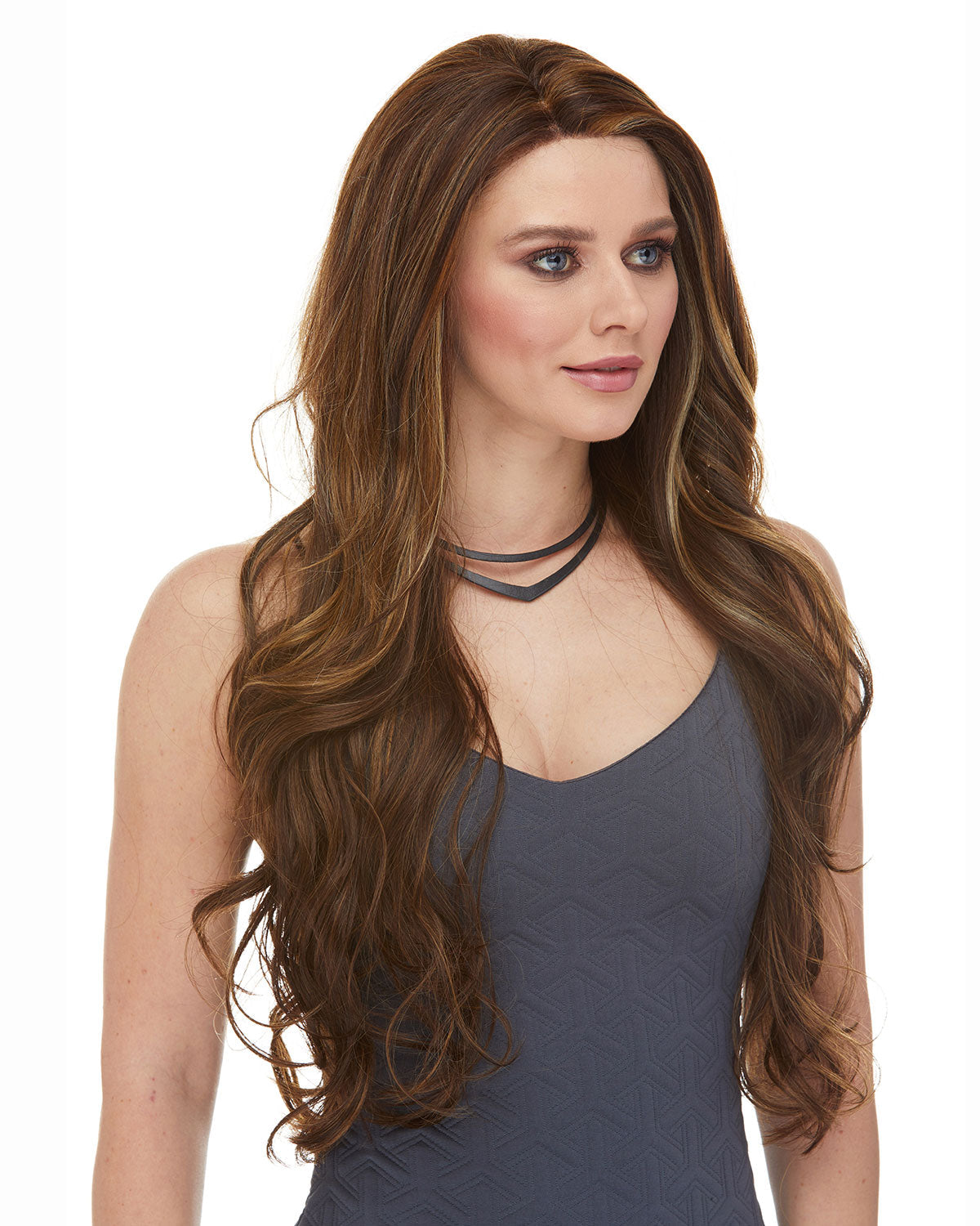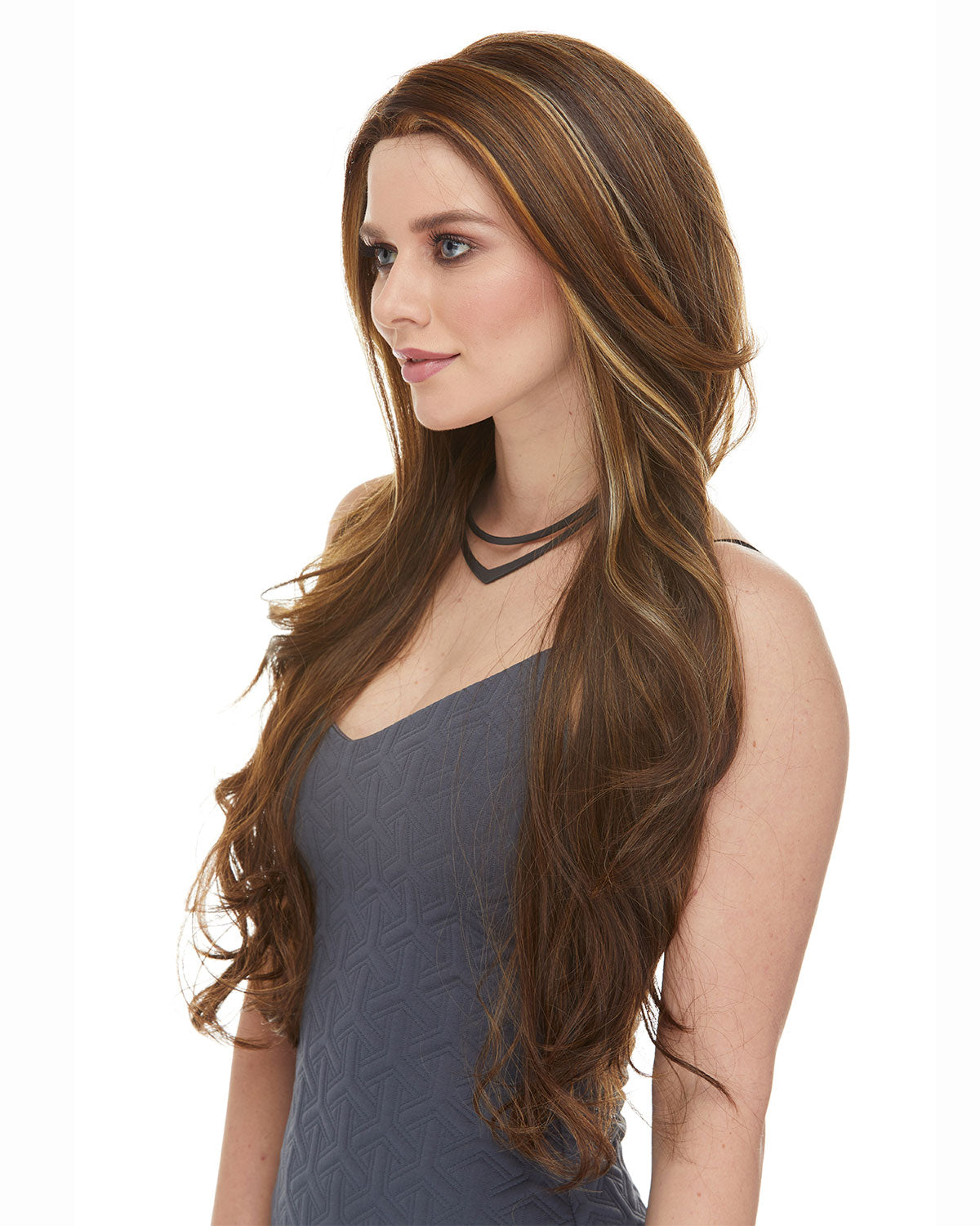 A long glamorous lace front wig with soft waves throughout the layered tresses.