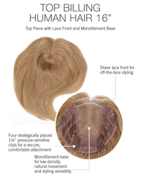 Upgrade to this top-class topper! Our fan-favorite Top Billing top piece is now available in luxurious 100% human hair, a glam 16? length, and a wider base to provide confident coverage for all levels of hair loss.
