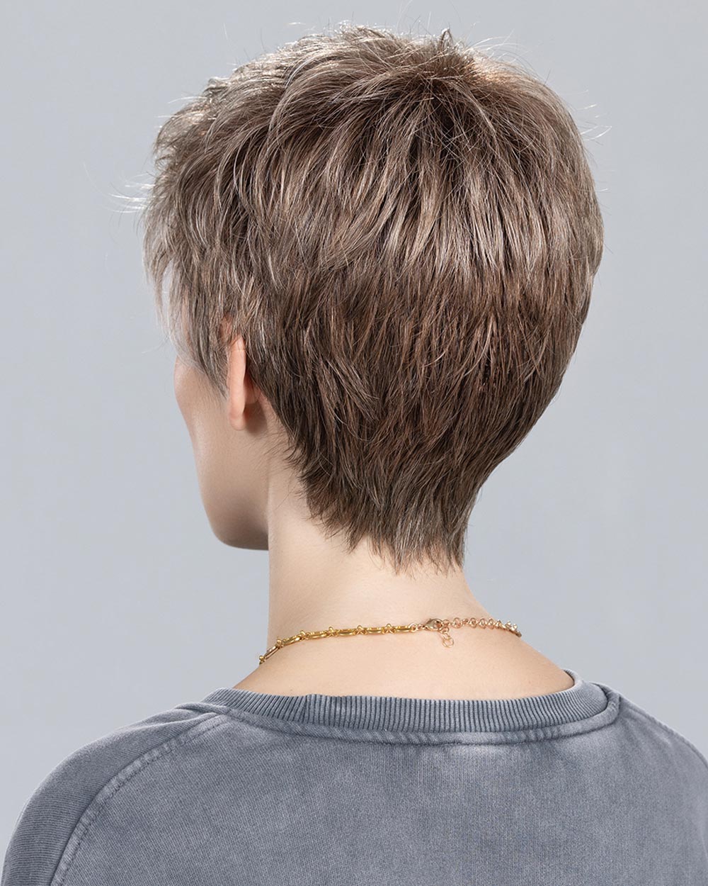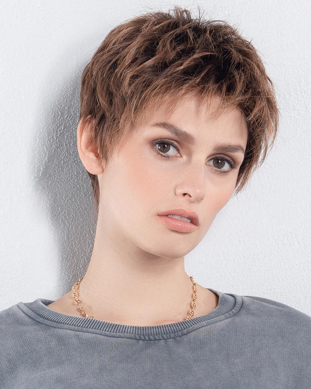The Chat Wig by Ellen Wille is a chic pixie cut with soft layers for natural movement and styling versatility. Made with heat-friendly synthetic fiber, this short wig can be worn sleek or textured. The extended lace front creates a seamless hairline, while the wefted cap, cooling ear tabs, and lightweight design ensure breathable, all-day comfort.