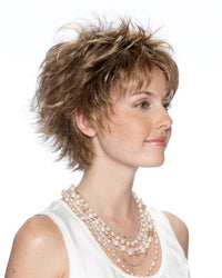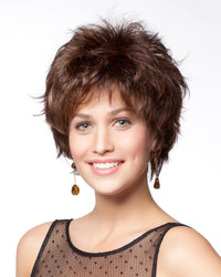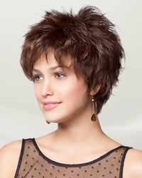 Is a short mixed layered style with beveled ends that is sophisticated but yet sassy with the hair flipped up in the nape area. A fun, flirty universally flattering style. A capless wig construction of thin spaced wefts along inSides of cap allow airy ventilation. Bendable ear tabs and thin adjusters at the nape. Simply effortless, ready-to-wear with a quick shake right from the box. Finger style and go.
