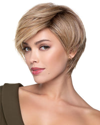 A short asymmetric Sides swept pixie with feathered texture and volume. Enough length to brush behind or over the ears.
