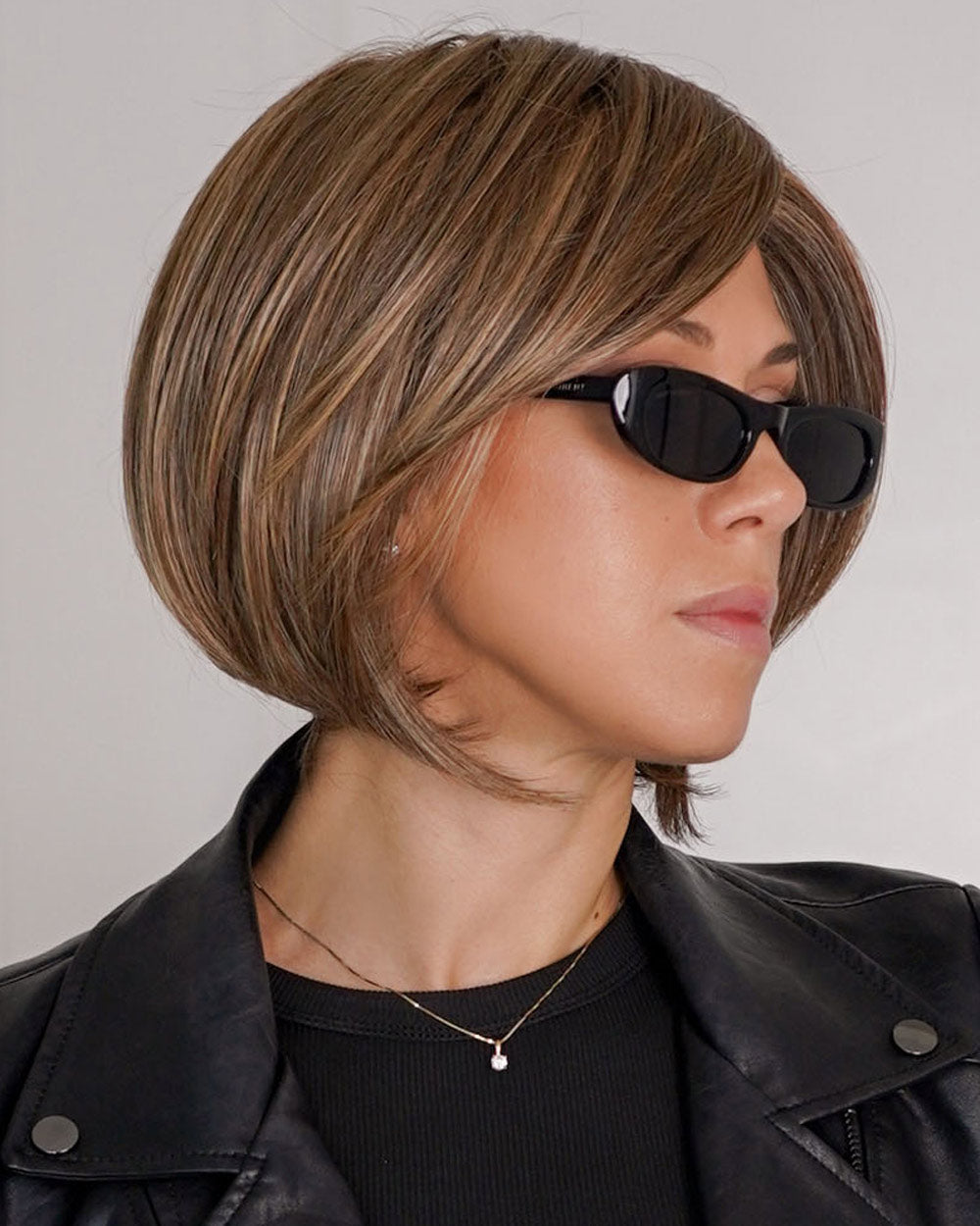Chin-length bob with soft layering and a refined side-swept fringe.