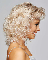 A collar length, all over layered shape with tons of spiral waved curls that can be scrunched for more fullness or gently brushed into soft waves. The eyelash bang adds a subtle frame to emphasize the eyes and the temple-to-temple lace front allows for off-the-face styling.