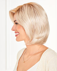 Temple-to-temple sheer lace along the front hairline allows the subtle bang to be worn forward or off the face.