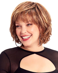 Mid-length layers of beachy waves, feathered bangs, a smooth silky top, and a bob back that falls below the collar. Featuring a Cool Comfort cap designed to mold itself and memorize the contours of your head for all-day, everyday comfort.