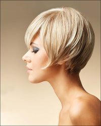 This short, smooth bob features full bangs and sleek, chin-length sides that are angled cut to blend with a short, neck hugging nape.