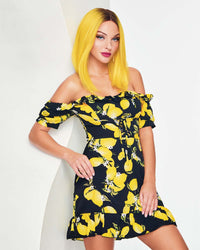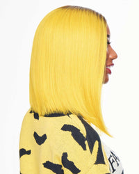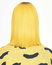 Bright, bold, and beautiful! Commitment-free fantasy yellow hair styled straight with a center part and lace front. The deeper root adds dimension and believability by tying in with your natural hair and brown color. Wear this electric shade with a neutral outfit and let your hair do the talking.