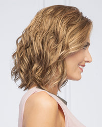 Featuring a hand-knotted monofilament part for various parting options and a sheer lace front for life-like, off-the-face styling, this shoulder length cut offers subtly curled, long layers that mirror fashion's move toward the long bob.