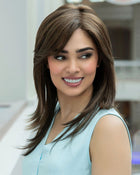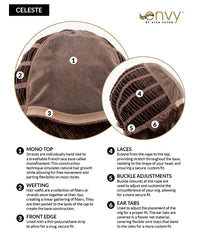 Celeste by Envy offers our Mono Top construction on this long-layered face framing bombshell. Layers upon layers create trendy tresses that can be combed with Sides wept bangs or towards the face for that bombshell bangs styling and appearance.